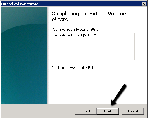 Once finished you should see the partition now fills all the available space on the virtual disk. Available storage space for that drive letter will have increased on the windows server.